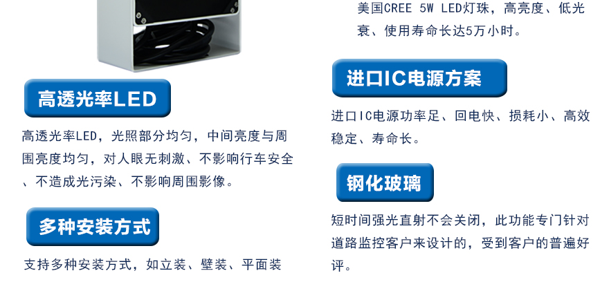 ★功率可調(diào),根據(jù)現(xiàn)場(chǎng)光照環(huán)境調(diào)節(jié)燈光亮度,在滿足圖像效果的前提下盡量減少光功率,節(jié)能環(huán)保;